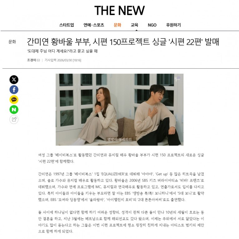 뮤직타임 [기사] 간미연 황바울 부부, 시편 150프로젝트 싱글 '시편 22편' 발매(THE NEW)