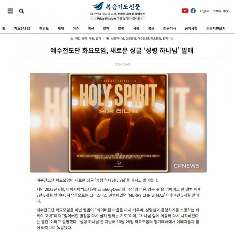 [기사] 예수전도단 화요모임, 새로운 싱글 ‘성령 하나님’ 발매(복음기도신문)