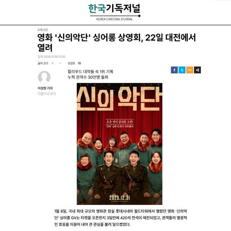 [기사] 영화 '신의악단' 싱어롱 상영회, 22일 대전에서 열려(한국기독저널)