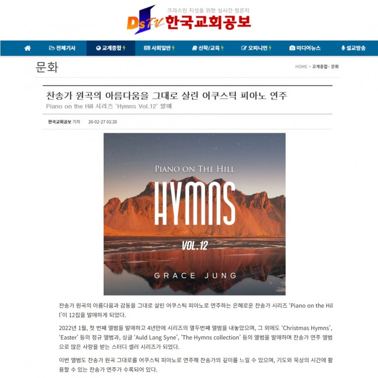 [기사] 찬송가 원곡의 아름다움을 그대로 살린 어쿠스틱 피아노 연주(한국교회공보)